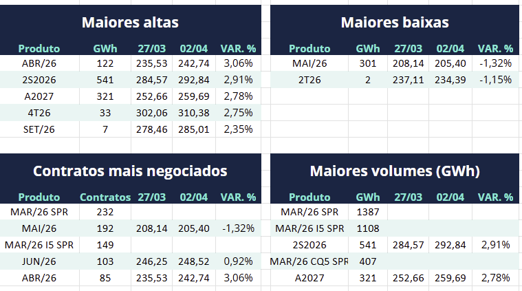 O 2S2026 (+2,91%), o contrato anual de 2027 (+2,78%), o 4T2026 (+2,75%) e o produto de setembro de 2026 (+2,35%) apresentaram altas. Por outro lado, alguns vencimentos fecharam a semana em queda, como maio de 2026 (1,32%) e o 2T2026 (1,15%).