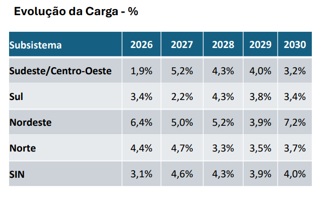 Os dados foram divulgados nesta quinta-feira, 9 de abril, pelas entidades responsáveis pelo cálculo. São elas a CCEE, o ONS e a EPE. O documento indica que a perspectiva é de crescimento médio anual de 4% da carga do Sistema Interligado Nacional (SIN) de 2026 a 2030.