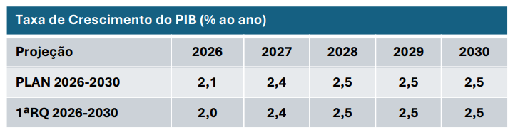 As entidades tomaram como premissas de curto prazo o crescimento de 1,8% do PIB brasileiro no 4o trimestre. Além disso, nesse horizonte de tempo citam também o cenário externo adverso e com alto nível de incerteza, principalmente devido aos conflitos no Oriente Médio. Além disso, de médio prazo são indicados a manutenção das projeções de 2027 a 2030, possível aumento de gastos durante o ano eleitoral que pode impactar negativamente no corte da taxa Selic.