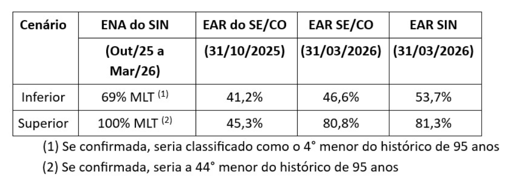 Caso o cenário inferior se confirme, o volume útil no Sudeste/Centro-Oeste será 22,9 pontos percentuais abaixo do valor verificado em março de 2025. Por outro lado, a confirmação do cenário mais otimista representaria 11,3 p.p. acima do registrado ao mesmo período do ano passado.