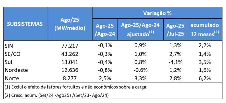 Os dados de agosto revelam variações nos padrões de consumo energético nas regiões do sistema interligado brasileiro. A região Norte registrou um aumento de 2,5% para alcançar 8.277 MWmed.