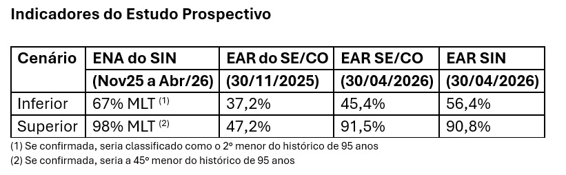 O quadro a seguir detalha os resultados dos estudos prospectivos até 30 de abril de 2026, para os cenários inferior e superior de afluências.