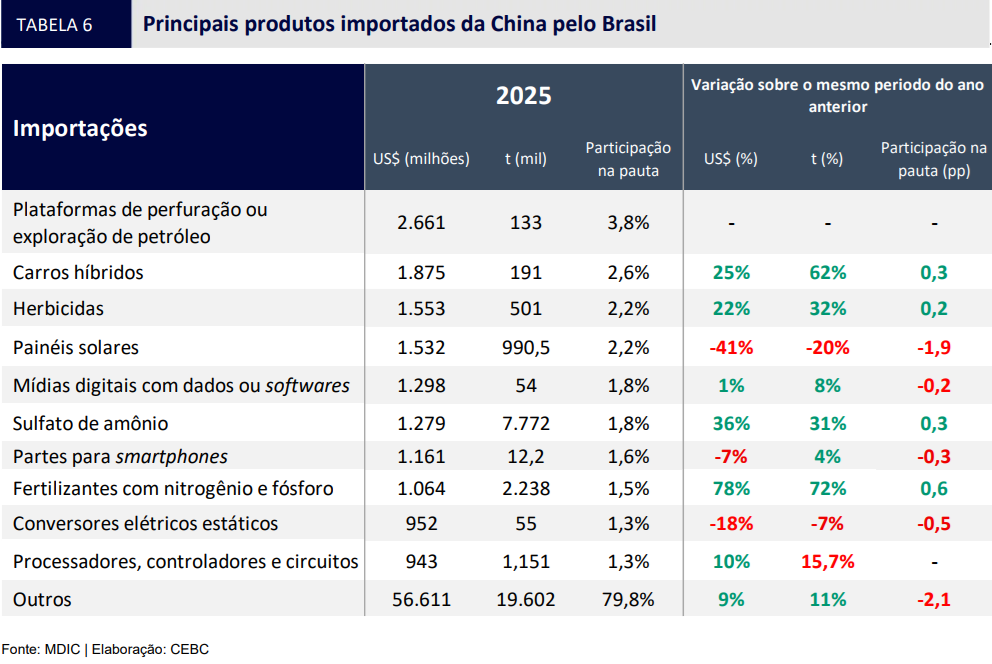 De acordo com o relatório, os veículos híbridos chineses importados chegaram a render uma cifra ainda maior. Chegaram a US$ 1,87 bilhão, valor é 25% maior do que no ano anterior. Com crescimento de 62% no valor dos negócios, esse é o segundo produto mais comprado do gigante asiático. Em contrapartida, as importações de carros totalmente elétricos caíram 37%, despencando do terceiro para o 11º lugar. Outro destaque do CEBC divulgado em setembro de 2025 é a liderança de aportes chineses por aqui.