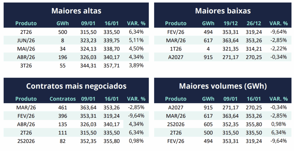 Por outro lado, alguns vencimentos de curto prazo fecharam em queda nos preços. Casos de fevereiro/26 (9,64%), março/26 (2,85%) e o contrato 1T2026 (2,22%). Já no longo prazo, os ativos anuais mantiveram liquidez, com o fornecimento para 2027 no submercado Sudeste totalizando 915 GWh negociados na semana.