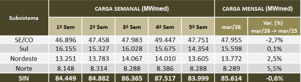 A carga no Sistema Interligado Nacional em março deve ter um recuo de 0,6%. Os dados foram divulgados nesta sexta-feira, 13 de março, pela revisão do Programa Mensal da Operação do Operador Nacional do Sistema Elétrico. No Sudeste/ Centro-Oeste, a carga tem queda de 2,7%. Na região Norte, a carga tem o seu melhor desempenho, subindo 5,5%. Em seguida vem o Nordeste, com alta de 2,5% na carga. No Sul, a carga tem variação mínima, de 0,1%. Na semana anterior, a projeção era de recuo de 0,5%.