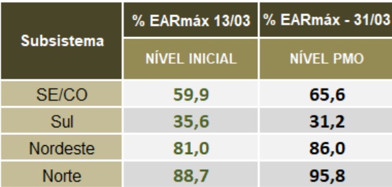 De acordo com o ONS, a estimativa é que os reservatórios das hidrelétricas do Sudeste terminem março com volume de 65,6%. Na região Sul, os níveis ficam em 31,2%. No Nordeste, a expectativa é que ao fim do mês o volume esteja em 86%. Na região Norte, a expectativa é de capacidade operativa de 95,8%.