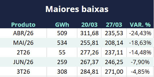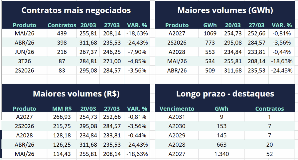 Entre os contratos de curto prazo, o destaque foi a queda no preço do contrato com entrega em abril de 2026, que recuou 24,43%. Apesar da redução, o ativo movimentou R$ 126,25 milhões em tela, consolidando-se como um dos mais negociados da semana. Outros contratos mensais também apresentaram quedas significativas, como maio (18,63%) e junho (7,9%).